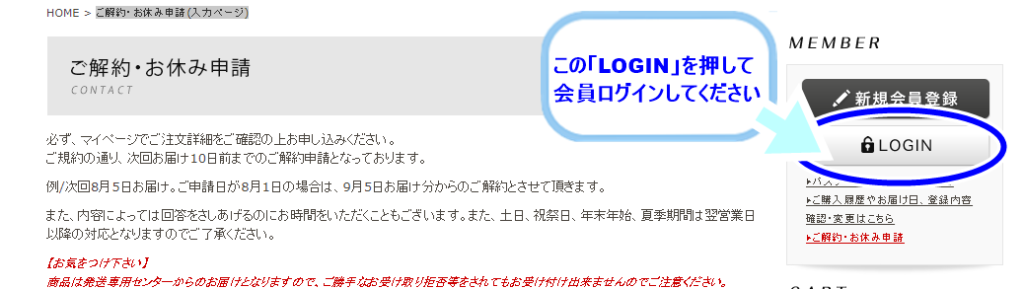 会員ログインし終わった後、再度、「ご解約・お休み申請」のページへ移動してください。
