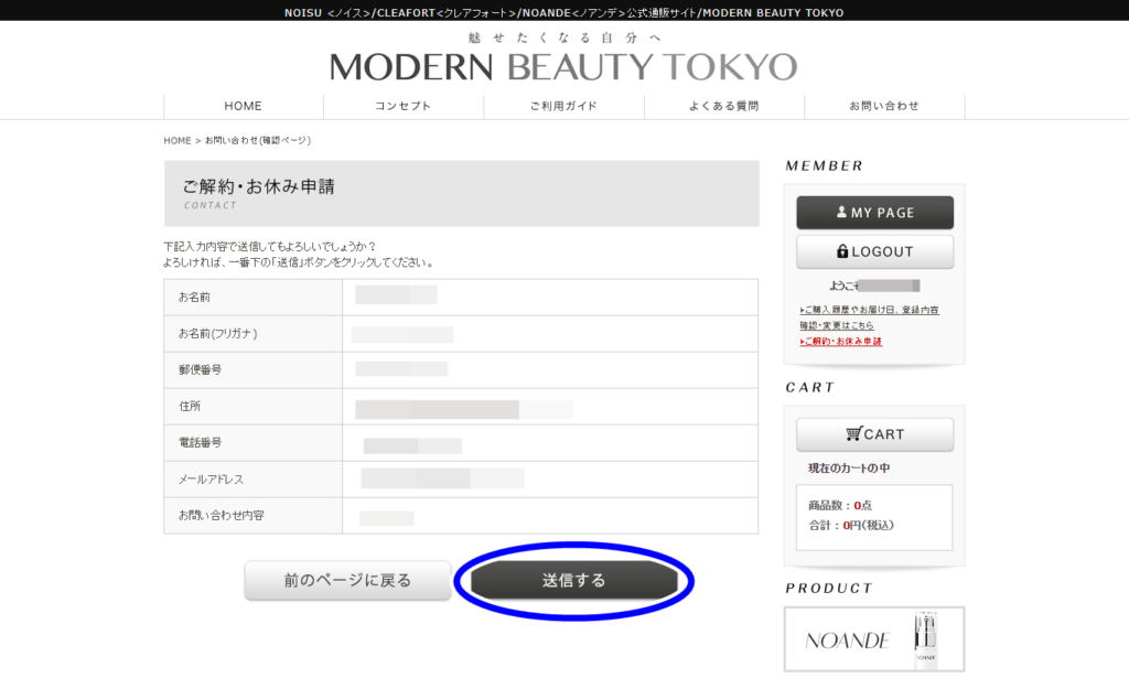 おそらく、ここで詳しく説明を書かなくても、ノアンデ公式サイトの「ご解約・お休み申請」のページを見るとわかりやすく説明していますので簡単に解約などできると思います。